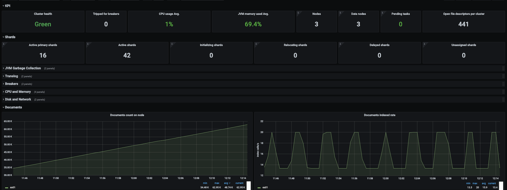 要使用此仪表盘,请遵循 Elasticsearch Exporter 快速入门。本快速入门通过设置带有预配置仪表盘、告警规则和记录规则的 Prometheus Elasticsearch exporter,帮助您监控 Elasticsearch 集群。本仪表盘包含以下指标的面板:
