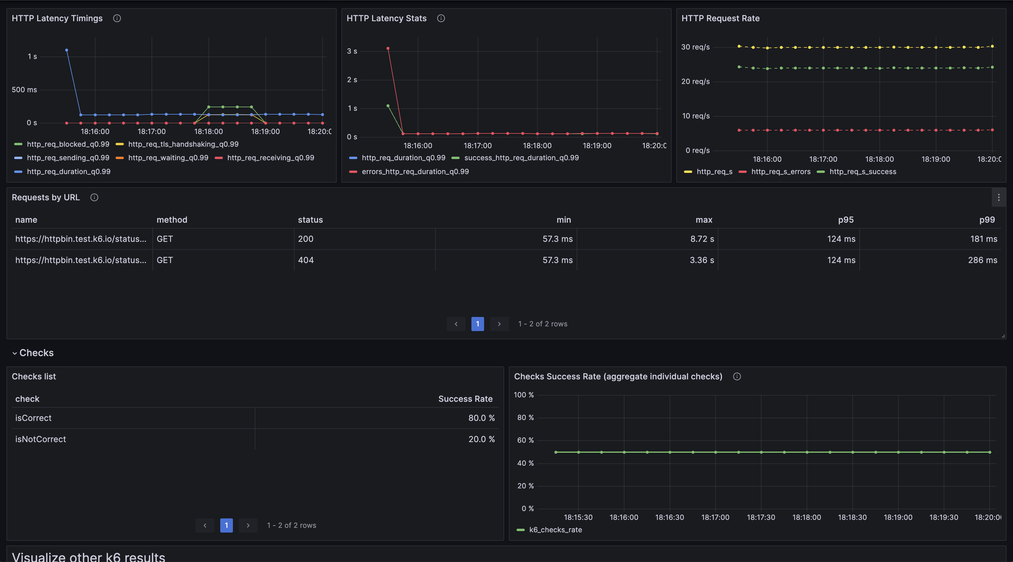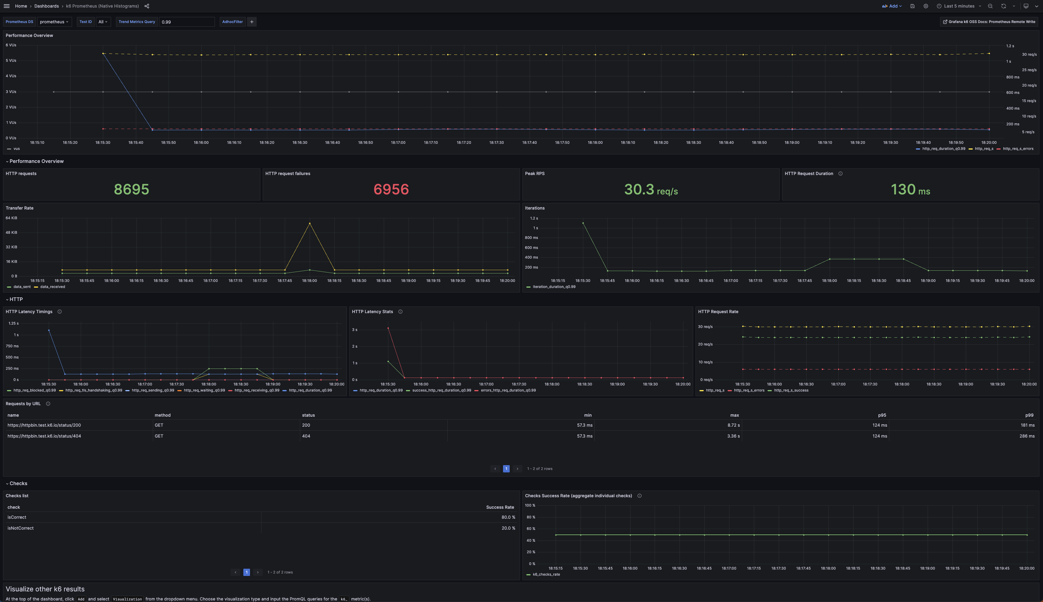 此仪表盘查询存储在 Prometheus 中的 k6 测试结果指标,其中 k6 趋势指标转换为原生直方图指标。请查阅 k6 文档,了解如何在 Prometheus 上启用原生直方图以及 k6 输出选项。