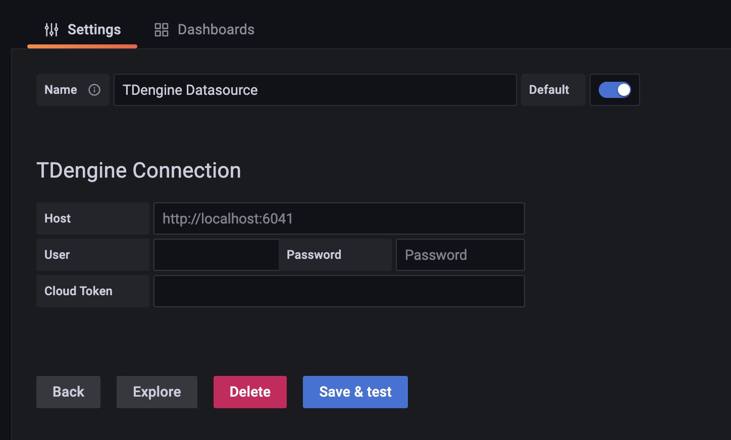 在 TDengine 数据源配置页面点击 Dashboard 标签页。